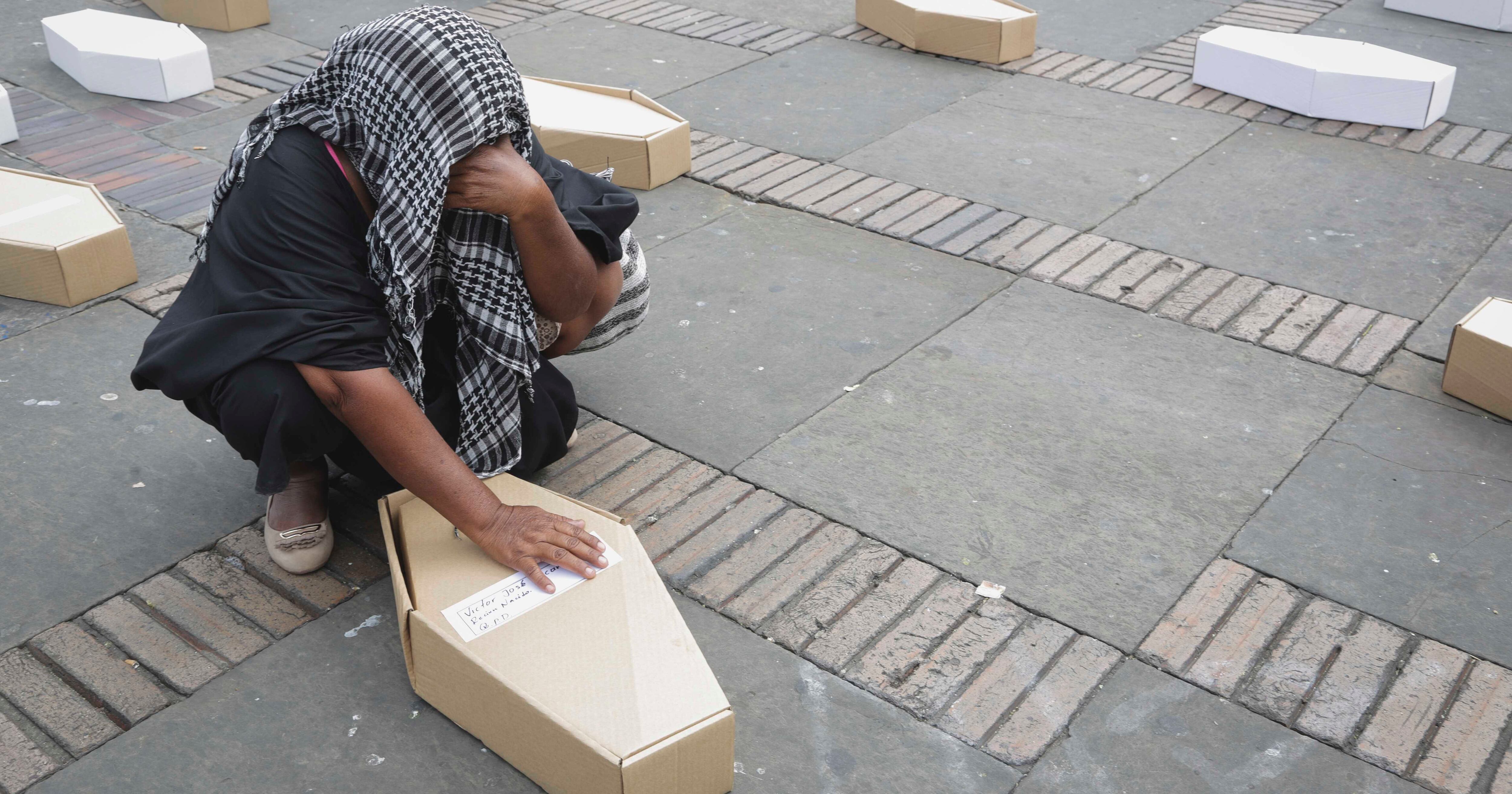Ataúdes simbólicas. Las mujeres del planton entre mantas y llantos caminan alrededor de la plaza con los ataúdes que representan a cada niño. Fotografía: Ana Vallejo / SEMANA