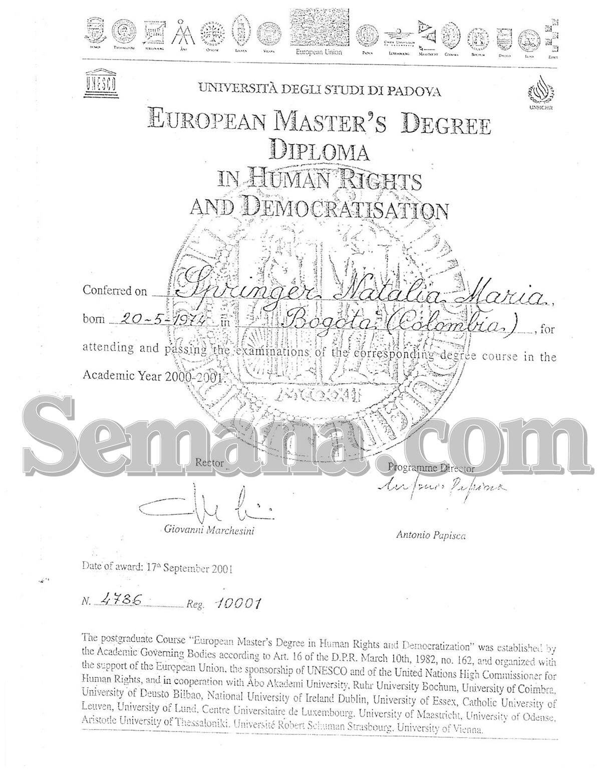 Para Natalia Springer, su currículum ha sido tanto su fortaleza como su talón de Aquiles. Desde que la analista y consultora terminó en el ojo del huracán por los contratos millonarios que firmó con la Fiscalía y con la Alcaldía de Valledupar, han salido a relucir varios episodios de su vida personal. Su profesionalismo ha sido puesto en tela de juicio y se ha dicho que lo que es en realidad es una mujer entradora con una hoja de vida llena de falsedades. Entre otras cosas se ha ridiculizado que haya cambiado ante notaría sus apellidos Lizarazo García, por el de su marido Springer, hoy socio suyo en los contratos de la Fiscalía. Sin embargo Springer ha asegurado que ella tiene todas las cualidades, que cada uno de sus títulos los “ha ganado a pulso”. Se declaró desconcertada por la forma como han “puesto en duda sus títulos. Dijo, una y otra vez, que siempre fue la mejor del curso y que podían ir a preguntar a todas las universidades por donde pasó, ya que nunca, según ella, “ha pasado desapercibida”. Independientemente del malestar que ha despertado entre ciertos grupos académicos, lo cierto es que Springer tiene títulos que hasta ahora no han sido desvirtuados. Se graduó como psicóloga y politóloga en la Universidad de los Andes. Posteriormente hizo un máster en derechos humanos en la Universidad de Padua, en Italia, y luego un doctorado en filosofía en la Universidad de Viena.