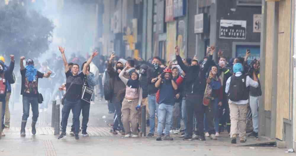 Los manifestantes subieron por la Carrera cuarta con Calle 11, al frente de la Biblioteca Luis Ángel Arango y hasta ese lugar llegan los gases lacrimógenos lanzados por el Esmad. Foto: Esteban Vega