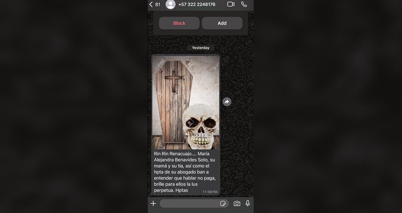 “María Alejandra Benavides Soto, su mamá y su tía, así como el hpta de su abogado van a entender que hablar no paga. Brille para ellos la luz perpetua. Hptas”. Así fue la amenaza que les llegó y que motivó una denuncia en la Fiscalía, con los detalles y una solicitud adicional de medidas de protección para garantizar la vida de la exasesora del ministro Bonilla.