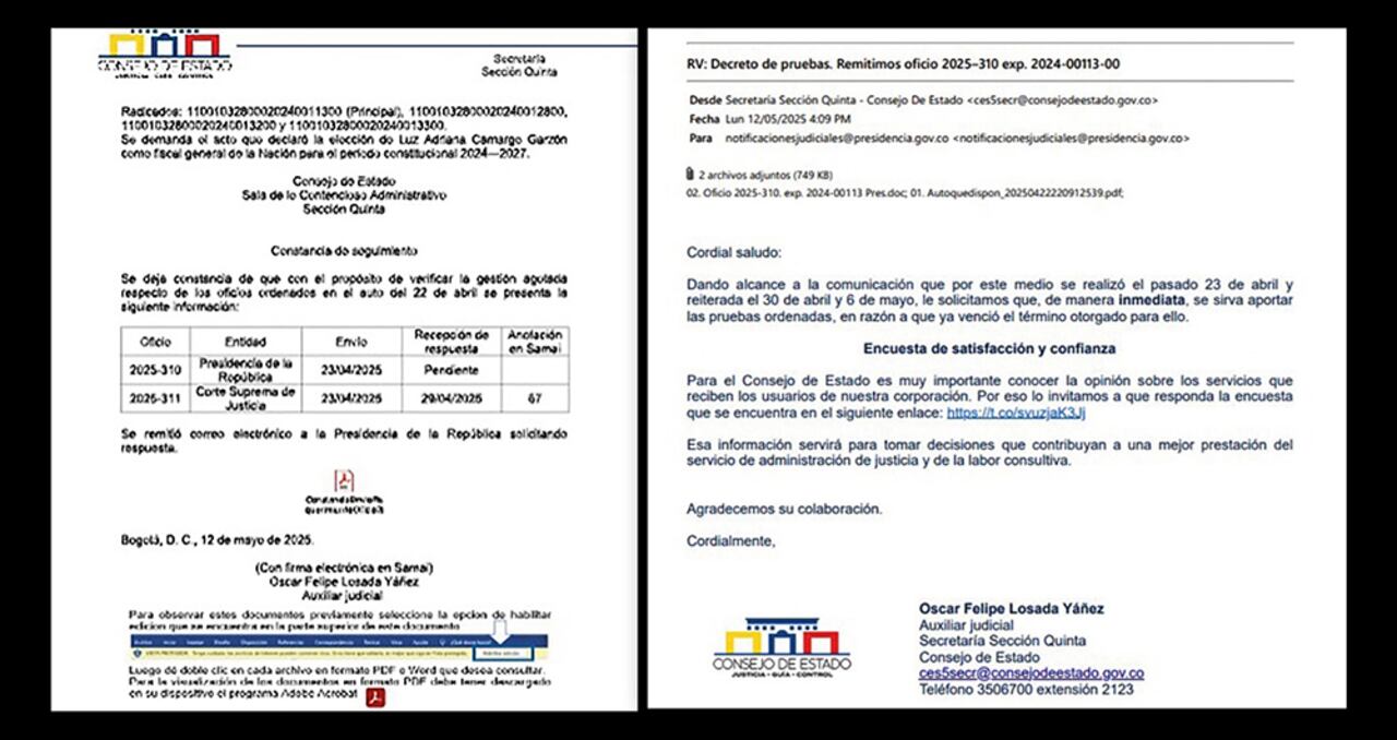 SEMANA conoció un correo electrónico que el pasado 12 de mayo la Secretaría de la Sección Quinta le envió a la Presidencia para volverle a pedir las pruebas que desde hace más de un mes están esperando para incluir dentro del proceso, que ya cumplió un año en el Consejo de Estado. El documento deja en evidencia que esa solicitud se ha hecho en tres oportunidades y la respuesta ha sido nula.
