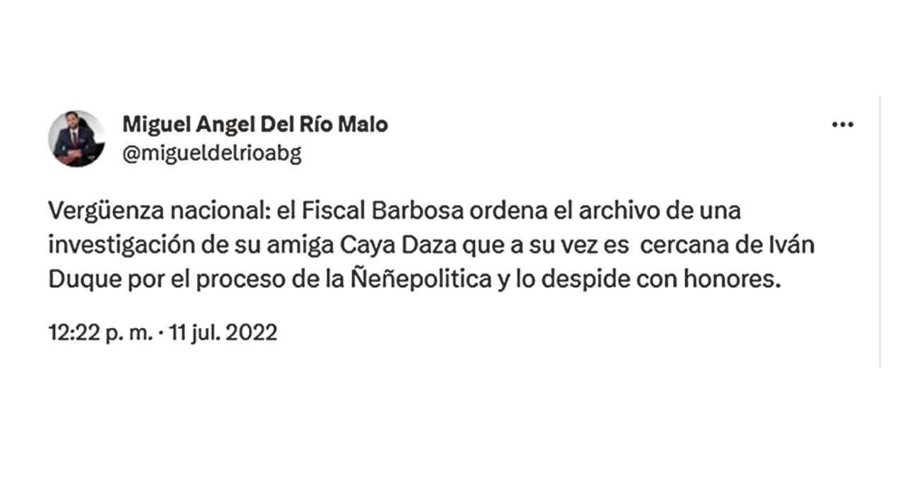 El abogado Del Río convirtió las redes sociales en su tarima de protesta y sin tapujos se enfrenta a la Fiscalía. En su cuenta en Twitter, el defensor lanza duros ataques contra el fiscal Francisco Barbosa, hasta el punto de desafiar, públicamente, a la justicia, por ejemplo, cuando hace unos días le advirtió al ente acusador que no asistiría a una diligencia de declaración en la investigación por la muerte del coronel Dávila, de quien alcanzó a ser su abogado durante algunas horas.