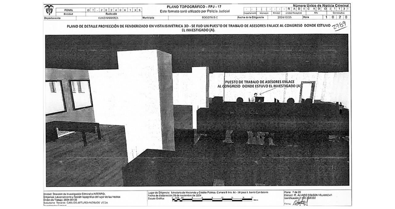 El documento, elaborado por la policía judicial para el magistrado Rodríguez, detalla cada espacio del Ministerio, desde el ingreso hasta la misma oficina del entonces ministro Ricardo Bonilla, de sus viceministros, las cámaras de seguridad de la sala de espera del ministro y de la secretaría del despacho. Incluso fue tomada la información de la cámara de seguridad de quien ejercía como enlace del Congreso, que para el momento de los hechos era María Alejandra Benavides.