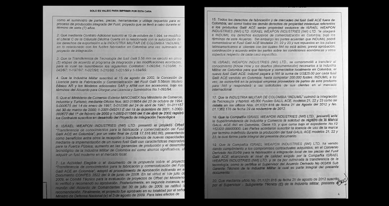 En la cláusula séptima, el contrato estipula claramente que “Israel Weapon Industries otorga a Indumil la licencia para la fabricación y comercialización del fusil Galil Ace, excepto para el cañón y mira nocturna, que se proveerá por IWI a Indumil”.