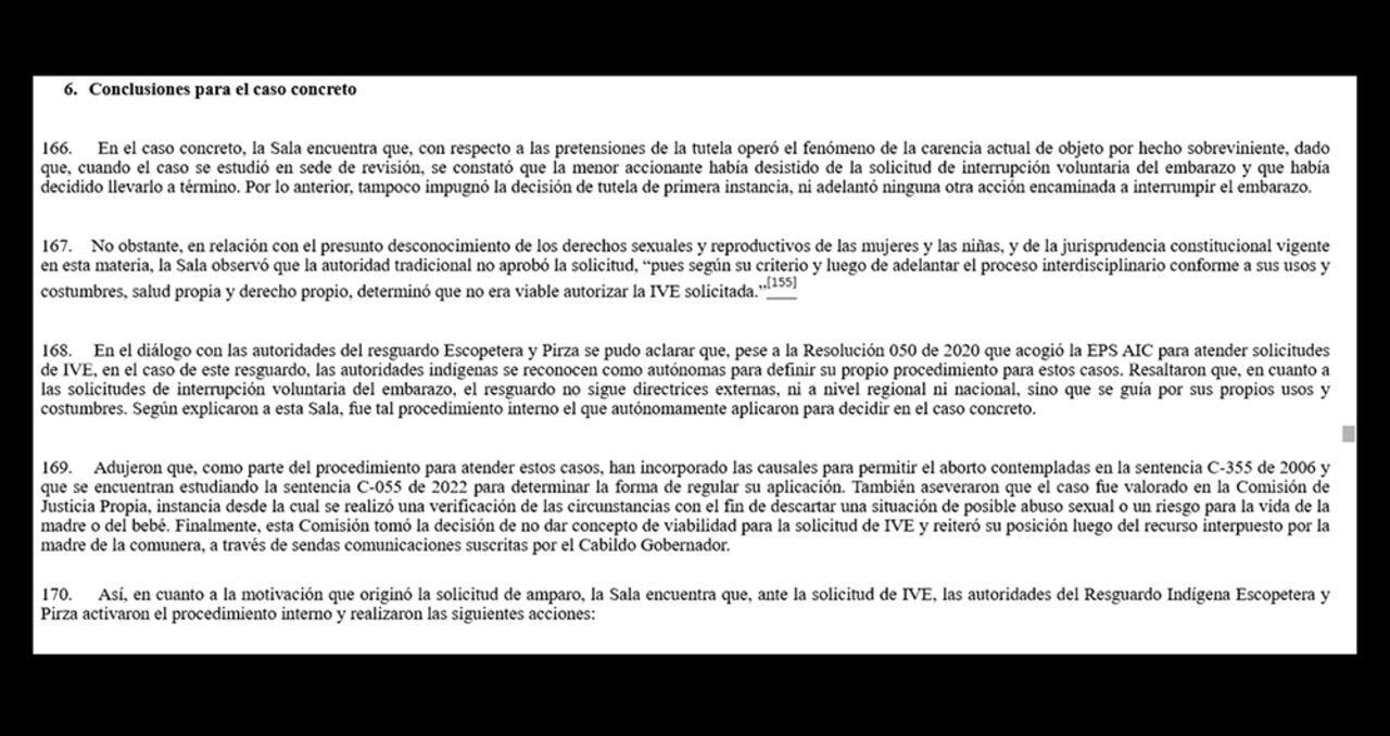 Sobre el posible desconocimiento de los derechos sexuales y reproductivos de las mujeres, la Corte manifestó que, pese a la resolución que acogió a la EPS Asociación Indígena del Cauca para atender abortos, las autoridades fueron autónomas para definir el procedimiento en este caso. Sin embargo, explicaron que aún siguen estudiando la sentencia que despenalizó el aborto hasta la semana 24 de gestación para regular su aplicación.