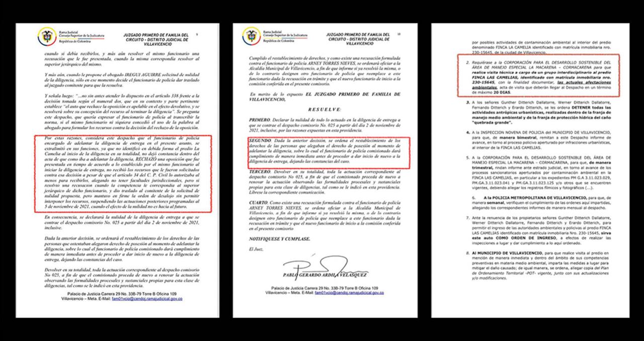 “Ante la renuencia de los propietarios, señores Gunther Ditterich Dallatorre, Werner Ditterich Dallatorre, Fernando Ditterich y Erardo Ditterich, para permitir el ingreso de las autoridades ambientales y policivas al predio finca La Camelia, sirva este auto como orden de ingreso, a efectos de realizar las inspecciones a lugar y dar cumplimiento a lo aquí ordenado”, señaló el Juzgado.