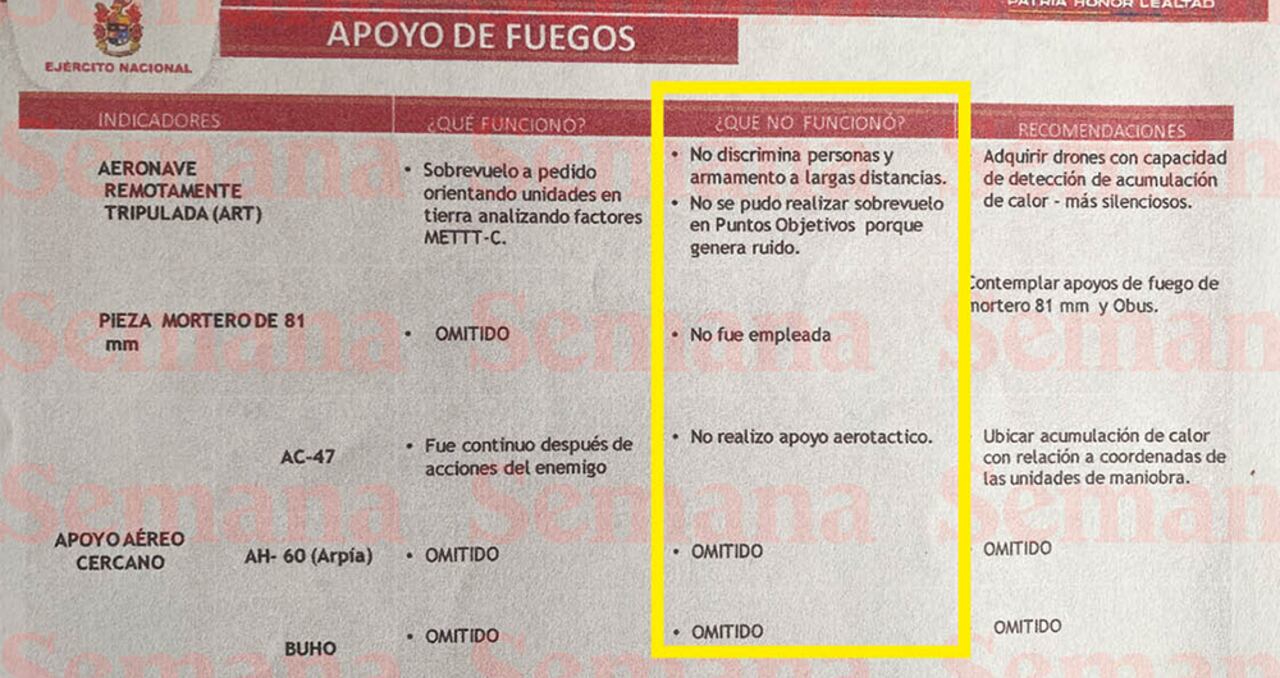 “La inteligencia falló, los helicópteros no tenían gasolina, las armas no disparaban, los radios no comunicaban y los drones no distinguían entre personas o armas”. Ese fue el contundente resumen que hicieron militares que participaron en la llamada operación Fortaleza. Los errores quedaron consignados en un documento denominado Revista después de la acción o RDA, que empieza con una advertencia de confidencialidad y resume un rosario de graves fallas en esa misión.