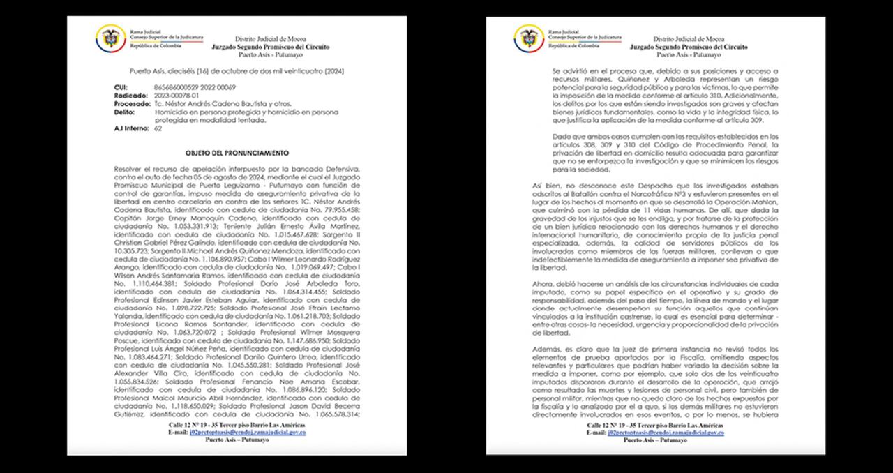 Pero ya en materia judicial, el documento del Juzgado de Puerto Asís, Putumayo, de 112 páginas, es contundente y cuestiona tanto a la Fiscalía como a la jueza de primera instancia, que decidió aceptar los argumentos de la Fiscalía y mandar a los militares a detención intramural sin discriminar responsabilidades.