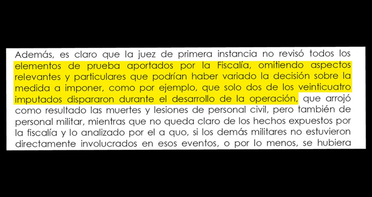 En cuanto a la jueza, advierte: “Es claro que la jueza de primera instancia no revisó todos los elementos de prueba aportados por la Fiscalía, omitiendo aspectos relevantes y particulares que podrían haber variado la decisión sobre la medida a imponer, como, por ejemplo, que solo dos de los veinticuatro imputados dispararon durante el desarrollo de la operación, que arrojó como resultado las muertes y lesiones de personal civil, pero también de personal militar”.