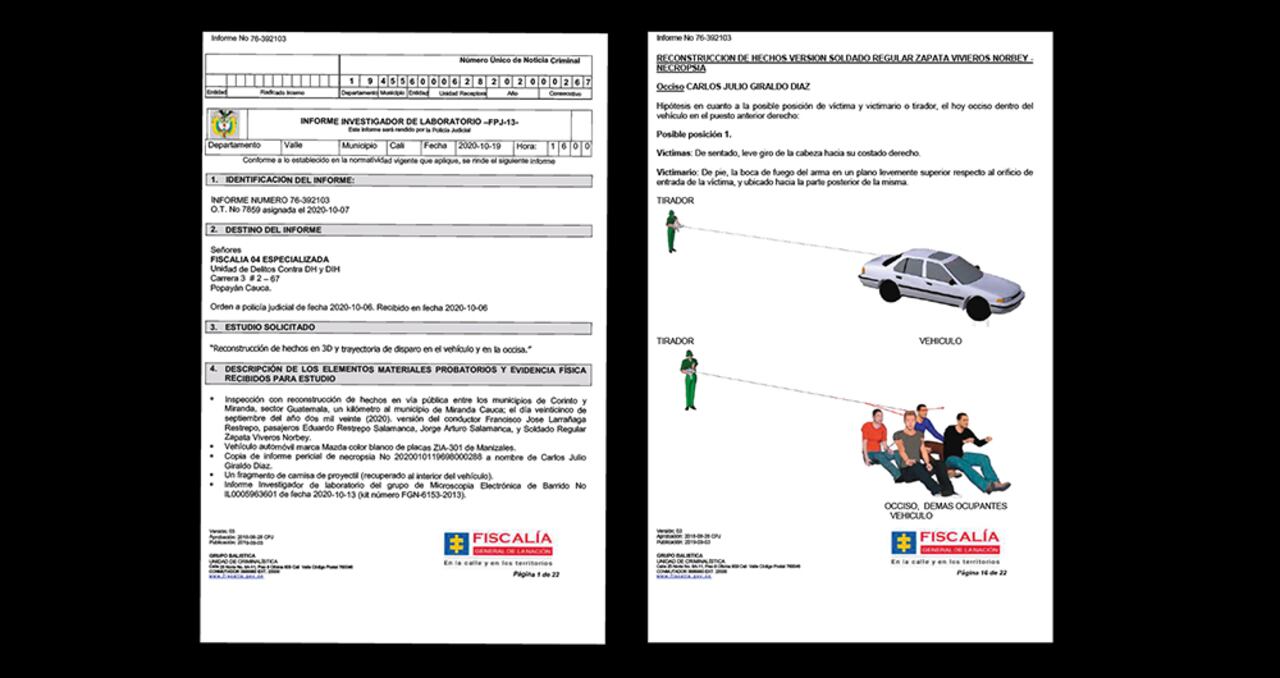 “Revisado lo descubierto por los peritos de la Fiscalía, si Cristian impactó la llanta trasera izquierda del carro desde el piso, era imposible que el disparo ingresara por el panorámico trasero lado derecho, esquina superior, pues no se corresponde con la trayectoria determinada por el balístico de la Sijín”. En este argumento –para el defensor– hay contradicciones y el disparo solo lo pudo hacer una persona de pie. Así se ve en el informe técnico de laboratorio de reconstrucción de los hechos, al que tuvo acceso SEMANA.