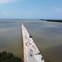 Allí, en medio del mar, se ve la imponente infraestructura compuesta por un viaducto que lleva a la plataforma en la que se erigen tres enormes grúas de 12 metros de altura.