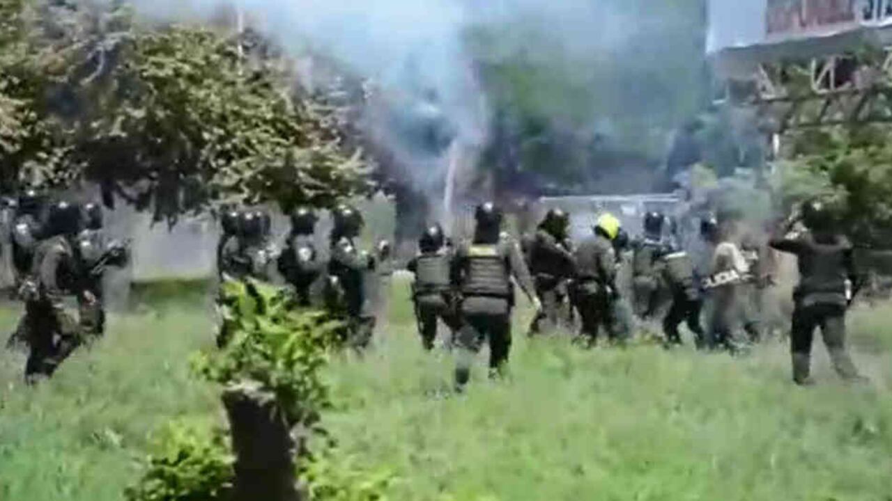 Un artefacto explosivo cayó sobre el hombre de 43 años, quien quedó gravemente herido. "El valiente uniformado cumplía con su deber durante una protesta en Neiva", dice el director de la Policía. Escenas fuertes.