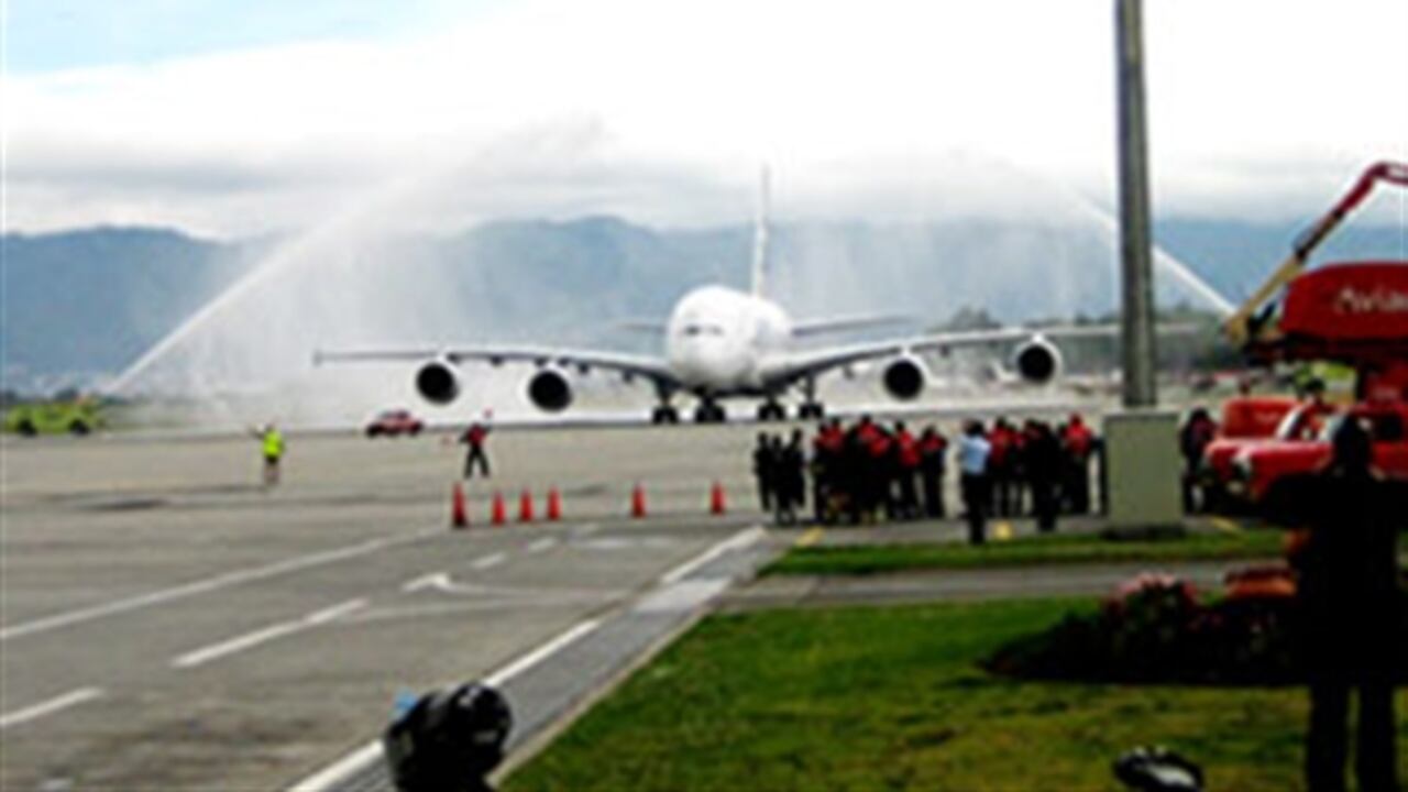 El aparato se movió lentamente por la pista hasta llegar a la rampa militar de Catam y luego se abrió paso por entre dos chorros de agua que arrojaban dos máquinas de bomberos para darle la bienvenida.