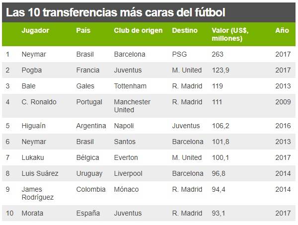 La anterior marca, por el pase del francés Paul Pogba del Juventus al Manchester United el año pasado (US$123 millones), ni siquiera llegó a la mitad de la cifra desembolsada por el brasileño.