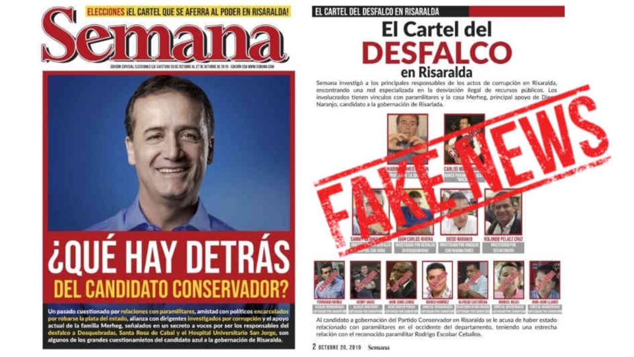 En la falsa contraportada publicaron las fotos de varias personas a las que vinculan con Diego Naranjo y a lo que llamaron “El cartel del desfalco”. Las dos páginas con fecha del 20 de octubre de 2019 son falsas. Publicaciones Semana cuenta con medios confiables y especializados en el manejo de estos y otros temas, los cuales son ampliamente difundidos por sus canales oficiales.
