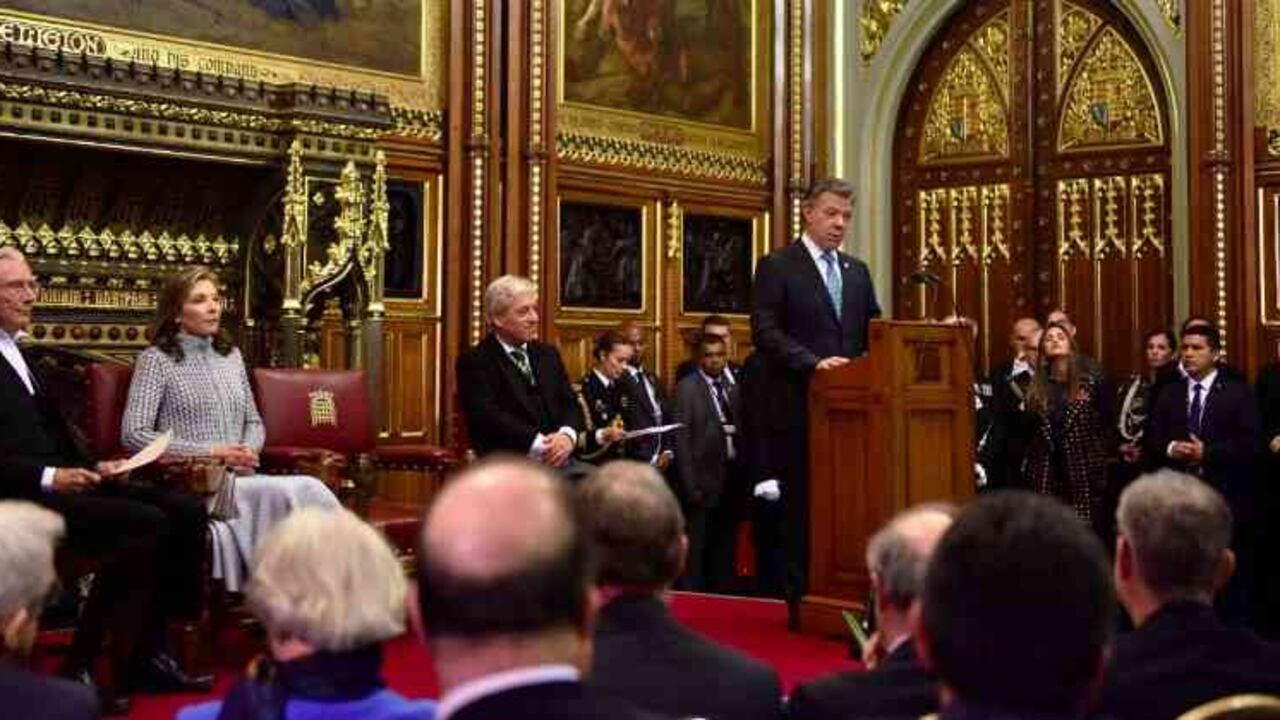 Al discurso, en la sala de la Cámara de los Lores que la reina usa para esperar su discurso anual ante el Parlamento, asistieron el antiguo primer ministro británico John Major y el líder norirlandés David Trimble, que fue galardonado con el Nobel de la Paz, como Santos, por el proceso de paz en la provincia británica.