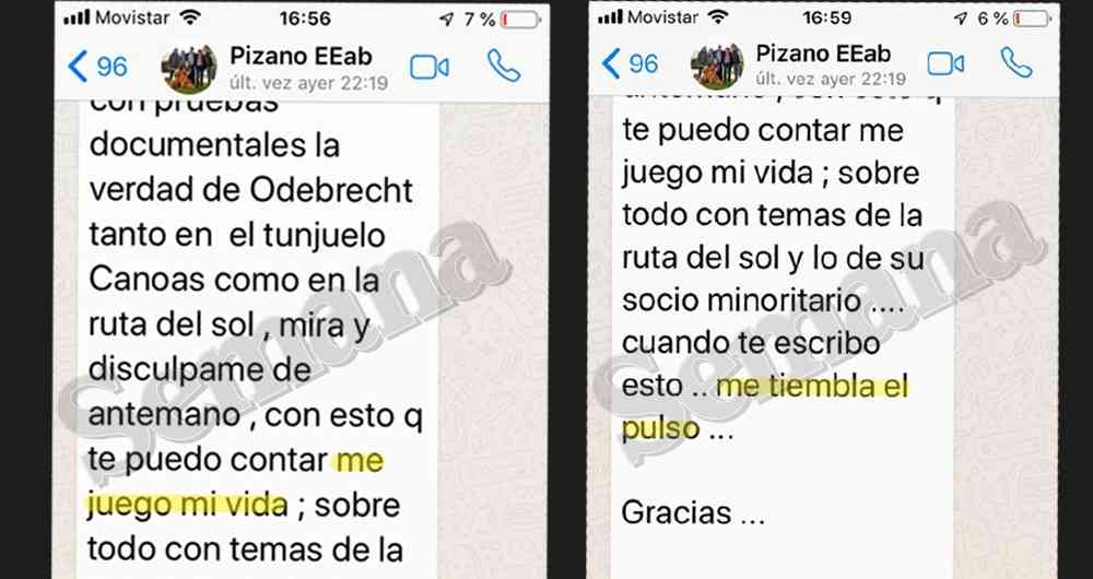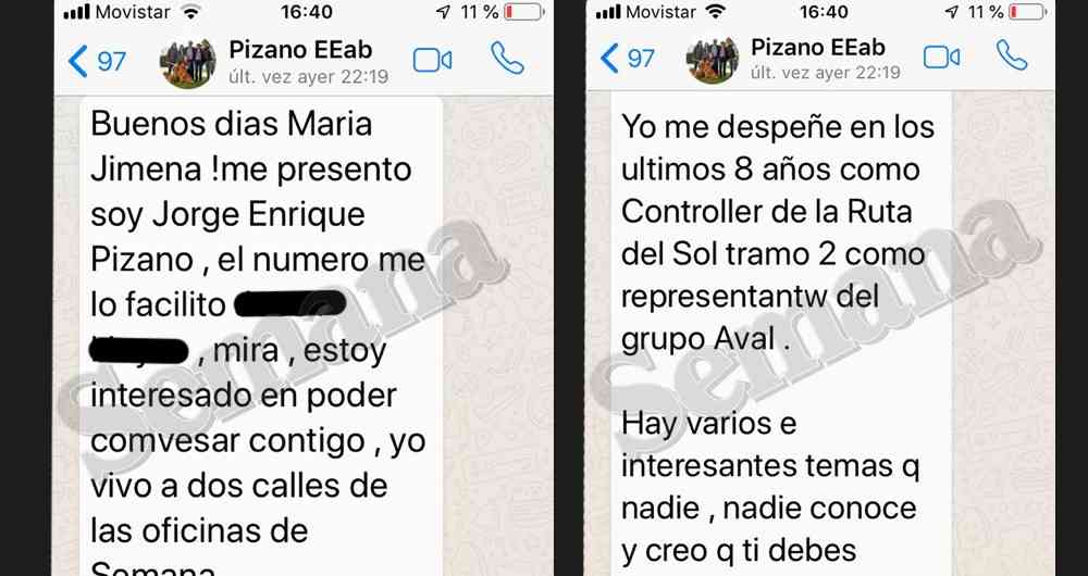 "Buenos días María Jimena, me presento: soy Jorge Enrique Pizano y te escribo porque estoy interesado en conversar contigo. Yo me desempeñé en los últimos 8 años como controller (auditor) de la Ruta del Sol II, en representación del Grupo Aval. Hay varios e interesantes temas que nadie, nadie, conoce y creo que tú debes saber sobre la verdad de Odebrecht, tanto en el contrato de Tunjuelo-Canoas como en el de la Ruta del Sol II. Mira y discúlpame de antemano; con esto que te puedo contar me juego la vida, sobre todo con temas de la Ruta del Sol y lo de su socio minoritario…cuando te escribo esto me tiembla el pulso”.