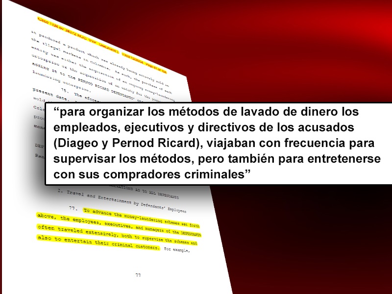 Ante la justicia de Estados Unidos, los departamentos colombianos sostuvieron que “para organizar los métodos de lavado de dinero los empleados, ejecutivos y directivos de los acusados (Diageo y Pernod Ricard), viajaban con frecuencia para supervisar los métodos, pero también para entretenerse con sus compradores criminales”. (Ver)