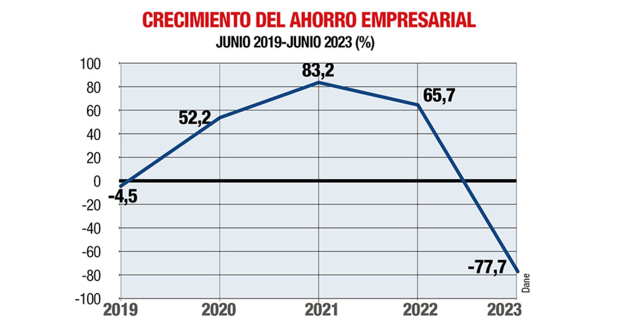 El ahorro nacional viene de capa caída. En junio de 2019 equivalía al 15,3 por ciento del PIB y en junio de 2023 cayó a 11,2. Hace un año las empresas fueron la fuente mayoritaria de ahorro para la economía y ahora son apenas la cuarta parte, cuando se derrumbó el -77 por ciento (Dane). Ese descenso del ahorro empresarial es el hecho económico más relevante y grave de Colombia en 2023.