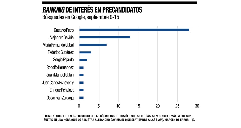 Gustavo Petro y Alejandro Gaviria son los precandidatos que despiertan mayor interés, si se juzga por las búsquedas en Google en la última semana (septiembre 9 a 15). Las búsquedas en Google no son un indicador de intención de voto, y por consiguiente no sustituyen las encuestas electorales. Pero son muy útiles para comparar el interés que despiertan los distintos candidatos. Posiblemente, el ranking sería muy distinto si se midiera por el número de likes en las respectivas cuentas de Twitter, donde no es factible expresar opiniones complejas, y donde predominan los insultos y las reacciones viscerales.
