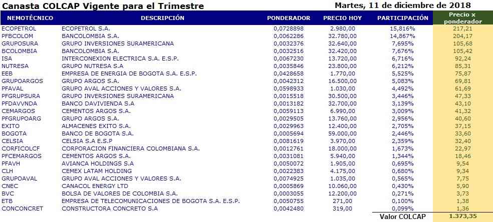 Aquí es importante notar que, en la mayoría de los índices, estos valores deben tener un techo ya que si, por ejemplo, una acción participara el 70% en el índice, pues no tendría mucho sentido tener toda una canasta sino simplemente seguir el comportamiento de esa acción en particular, este límite en el Colcap es del 20%.