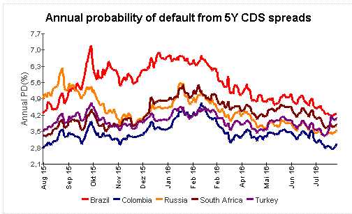 Esta gráfica muestra cómo los instrumentos que valoran la probabilidad de quiebra de Turquía (CDS) han sobrepasado la probabilidad de no pago de la deuda Rusa. Pero también muestra que Colombia es el país con el menor riesgo de crédito.