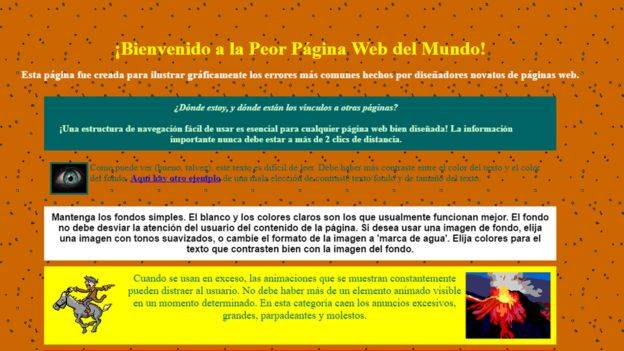 El movimiento continuo de algunos textos y las animaciones tampoco ayudan; todo resulta extremadamente ruidoso y confuso. "Esta página fue creada para ilustrar gráficamente los errores más comunes hechos por diseñadores novatos de páginas web", reza un texto en Times New Roman en la parte superior. Pero sus creadores no son precisamente novatos.