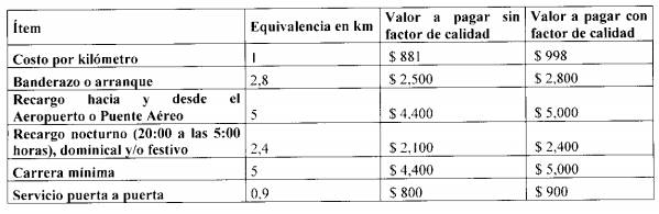 Para la liquidación de la tarifa del servicio de transporte y los recargos, se tendrán en cuenta los parámetros consignados en la siguiente tabla:
