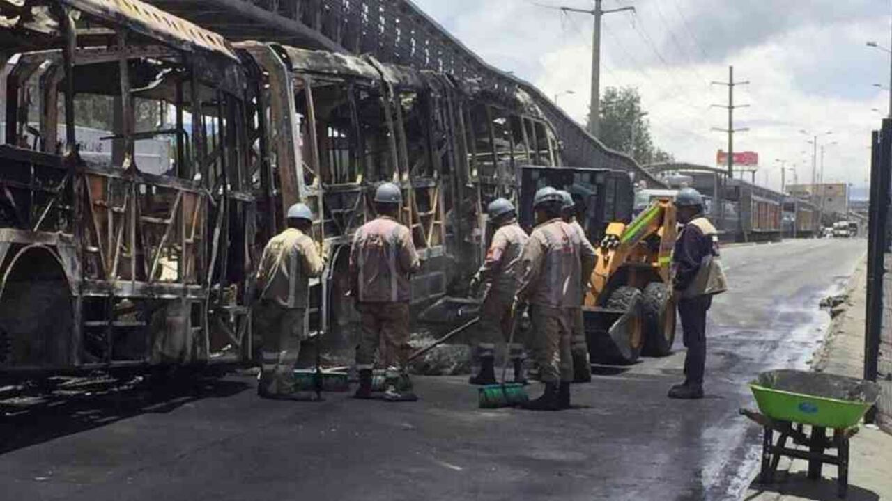 Además, el gerente de TransMilenio, Felipe Ramírez, indicó que hay dos conductores heridos por esquirlas de vidrios rotos.
