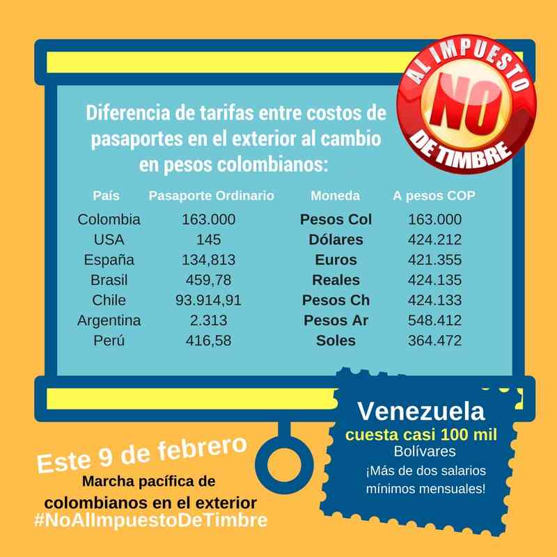 Por este motivo, están convocando una marcha el próximo jueves 9 de febrero de 2017, a las 11 a.m. local para manifestar su rechazo frente a los consulados de Colombia en Estados Unidos, Canadá, España, Alemania, entre otros países. La ciudadanía rechaza el aumento en el impuesto de timbre de $51 dólares a $56 dólares, los cuales representan un 40% del costo total de este papel, cuyo valor es de $145 dólares, manteniéndose como uno de los más caros del planeta.