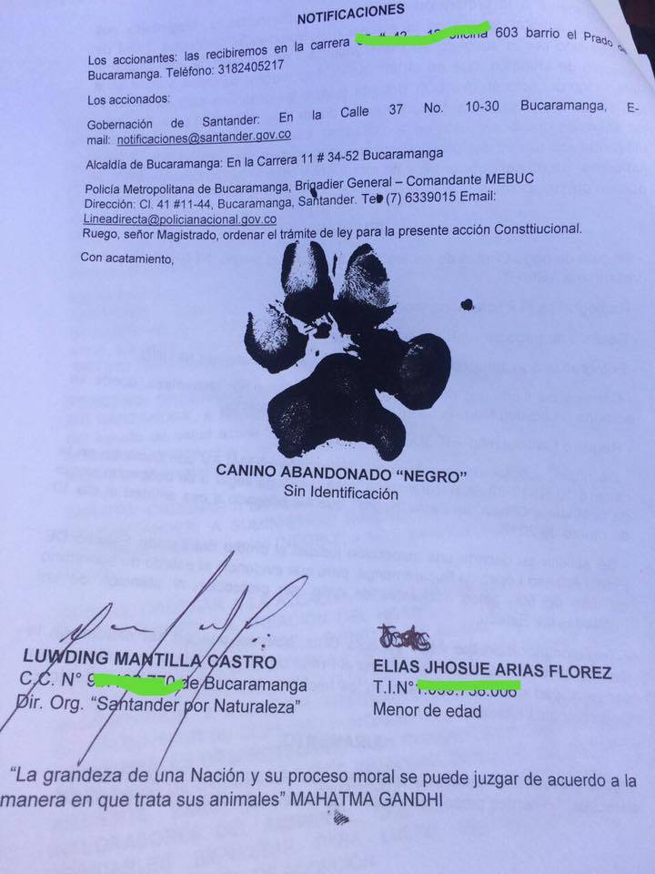 El perrito criollo fue encontrado en pésimas condiciones por una familia que no tiene los suficientes recursos para garantizar su atención veterinaria, por lo que la organización Santander por Naturaleza, encabezada por Luswing Mantilla, se ha ingeniado la forma de hacer que Negro firme el documento con su propia pata.