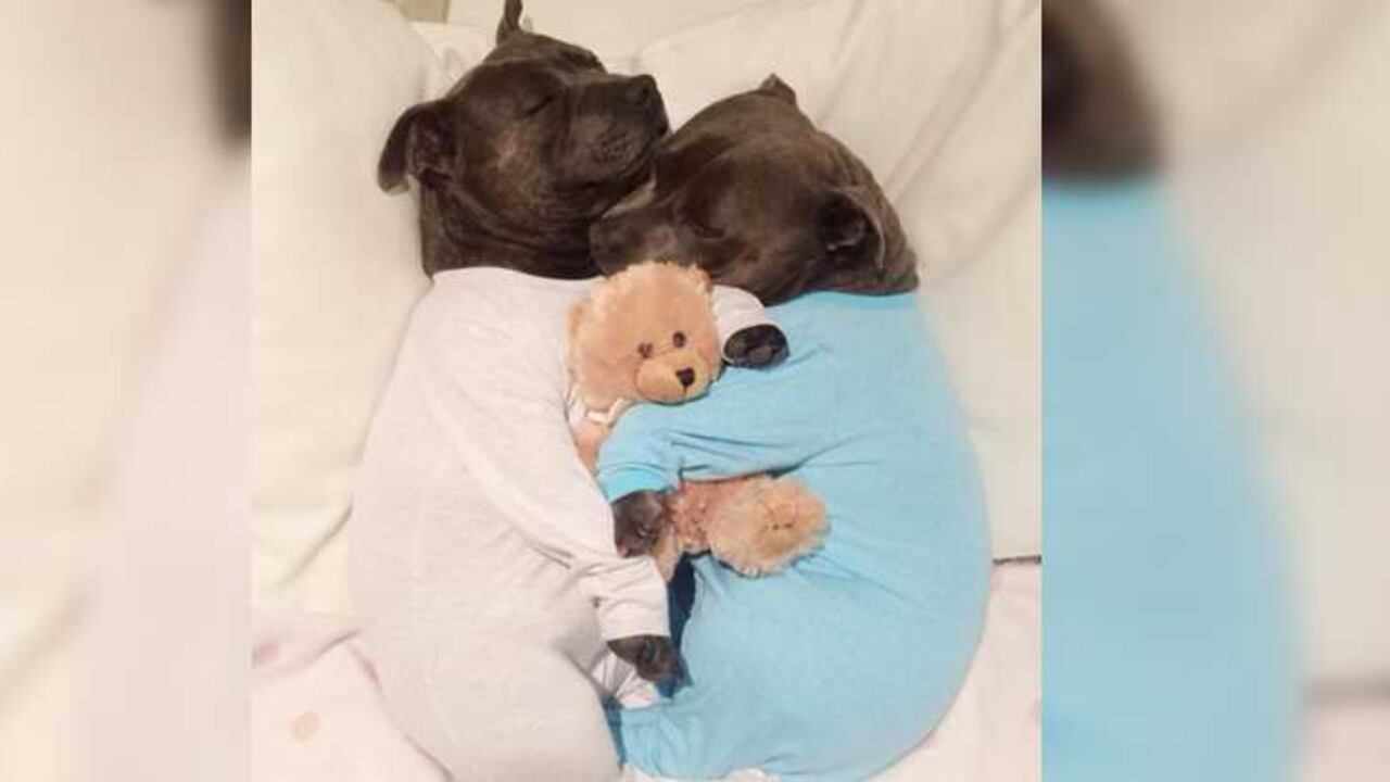 Estos Pitbulls duermen tan calienticos como nosotros. y su atuendo nocturno se ha convertido en la sensación. ¡Mira qué lindas pijamas tienen y qué dulces se ven!