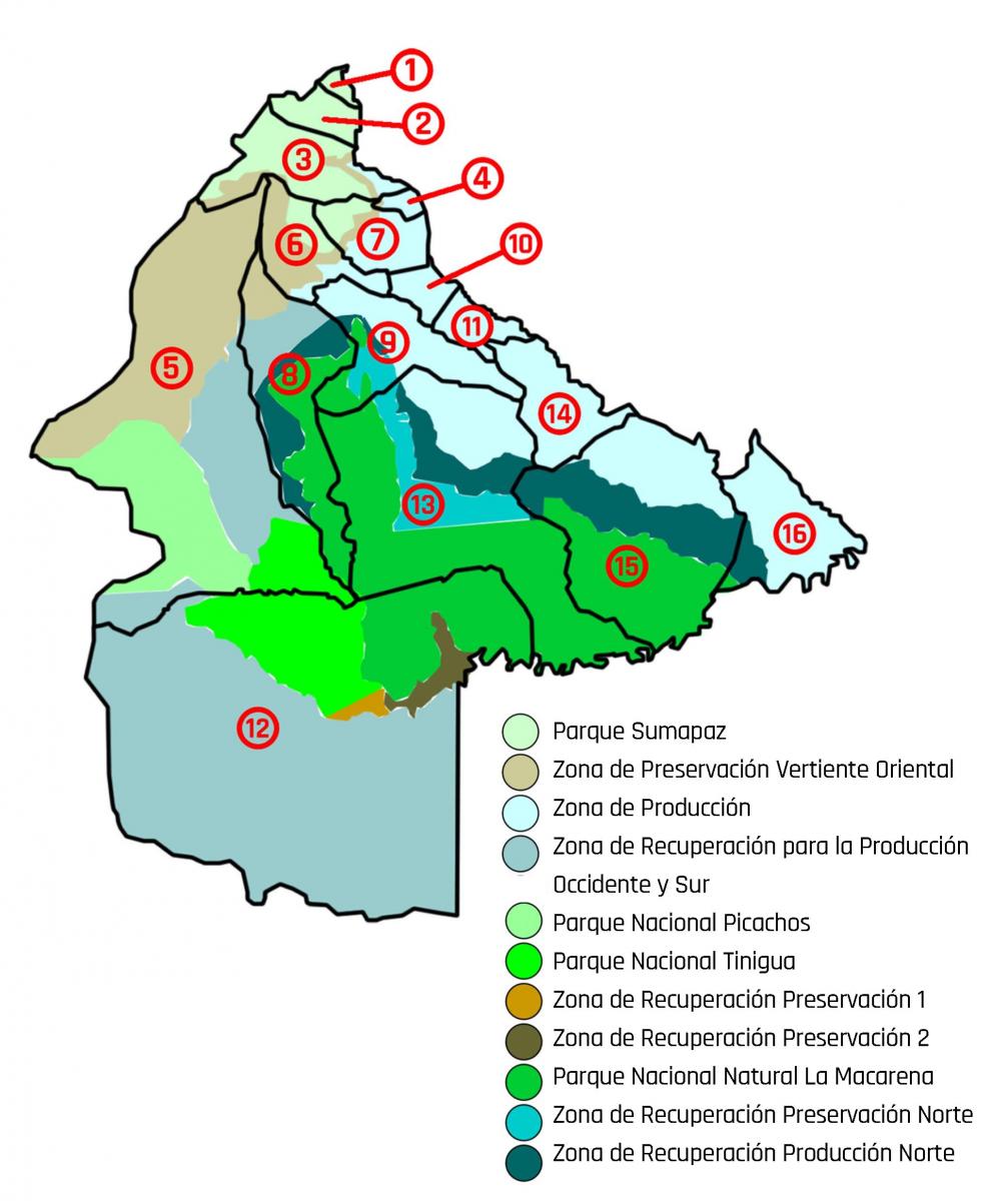 Las otras dos zonas son de recuperación, donde tan solo hay producción primaria de yuca, maíz, plátano y piña; y la zona del parque nacional natural sierra de La Macarena. Aquí están prohibidas las actividades pecuarias y agrícolas.