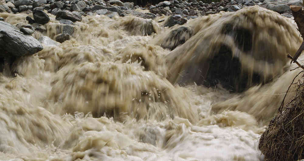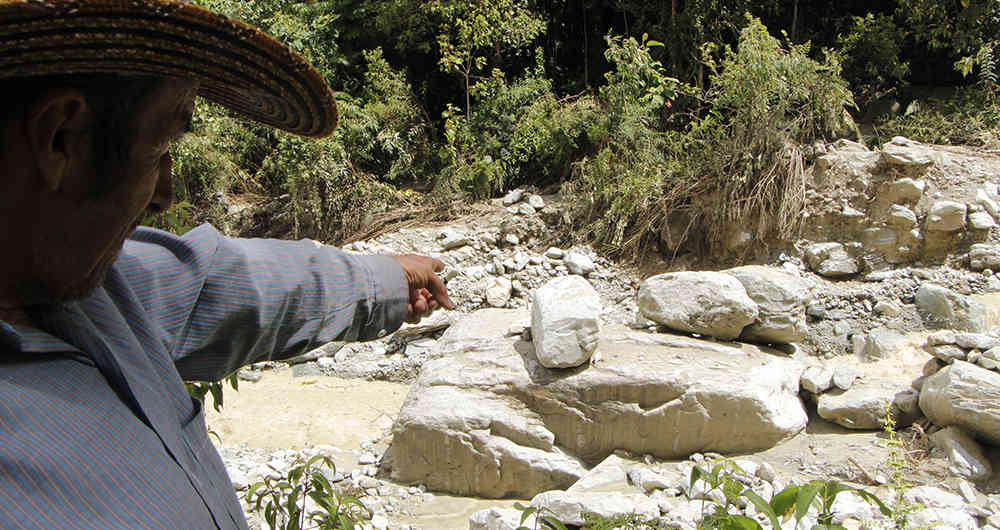 Al coronar una pendiente, junto a un bosque de pinos, el espectáculo resulta impactante: varias capas de rocas cubren, de orilla a orilla, el lecho de la quebrada. Son miles, algunas de casi dos metros de alto. Fueron arrastradas por las aguas embravecidas desde lo alto de la montaña y depositadas en este lugar, donde el cauce se explaya junto a un potrero. Los habitantes temen que un día las piedras irrumpan en el pueblo.