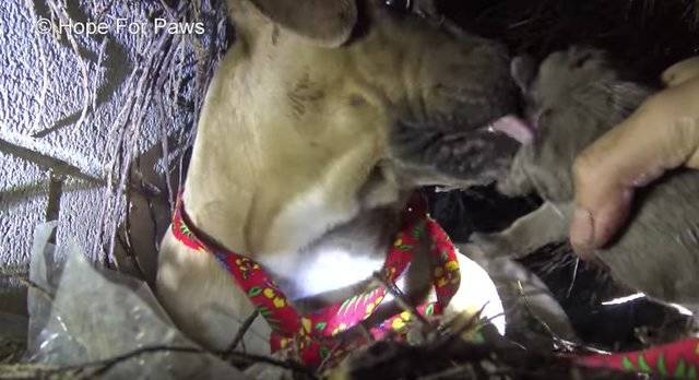Con un poco de esfuerzo y comida, los rescatistas lograron llegar al rincón donde la madre intentaba mantener calientes a sus ocho cachorritos a los cuales alimentaba, aunque no hubiese recibido comida por mucho tiempo.