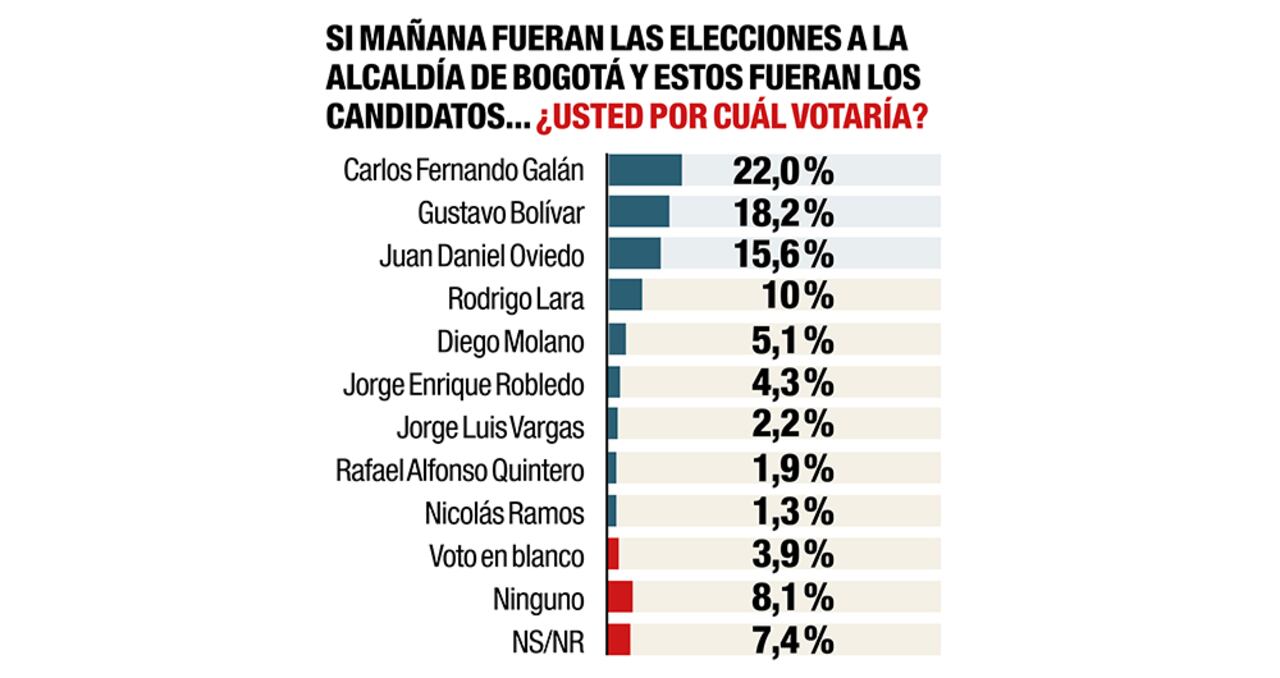 Carlos Fernando Galán (22 por ciento) y Gustavo Bolívar (18,2 por ciento) están en un empate técnico, teniendo en cuenta que el margen de error de la encuesta en la capital del país es del 4,3 por ciento. En el tercer lugar aparece Juan Daniel Oviedo (15,6 por ciento), en empate técnico con Bolívar.