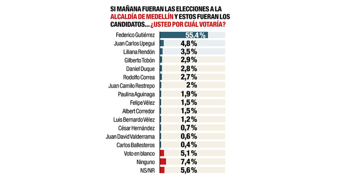En la capital de Antioquia, la encuesta es liderada precisamente por el exalcalde Federico Gutiérrez (55,4 por ciento), seguido de Juan Carlos Upegui (4,8 por ciento) y Liliana Rendón (3,5 por ciento). Upegui es el candidato del alcalde Daniel Quintero, cercano al presidente Petro, quien ha chocado permanentemente con Gutiérrez.