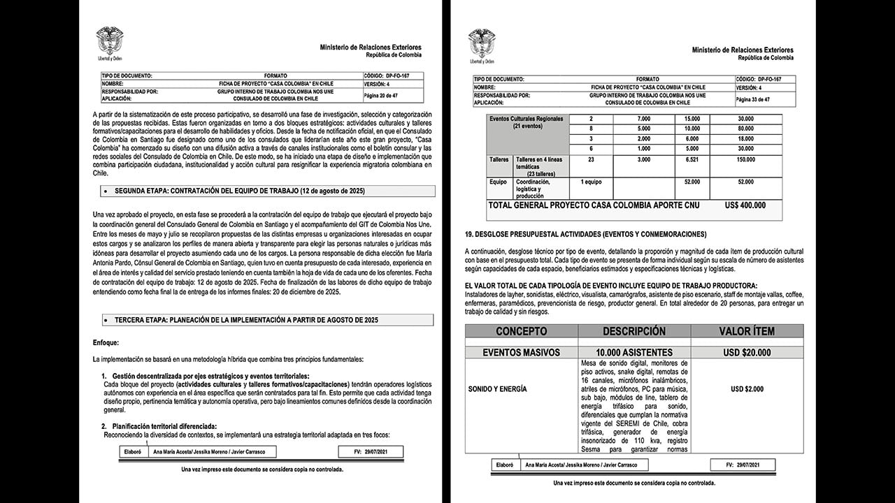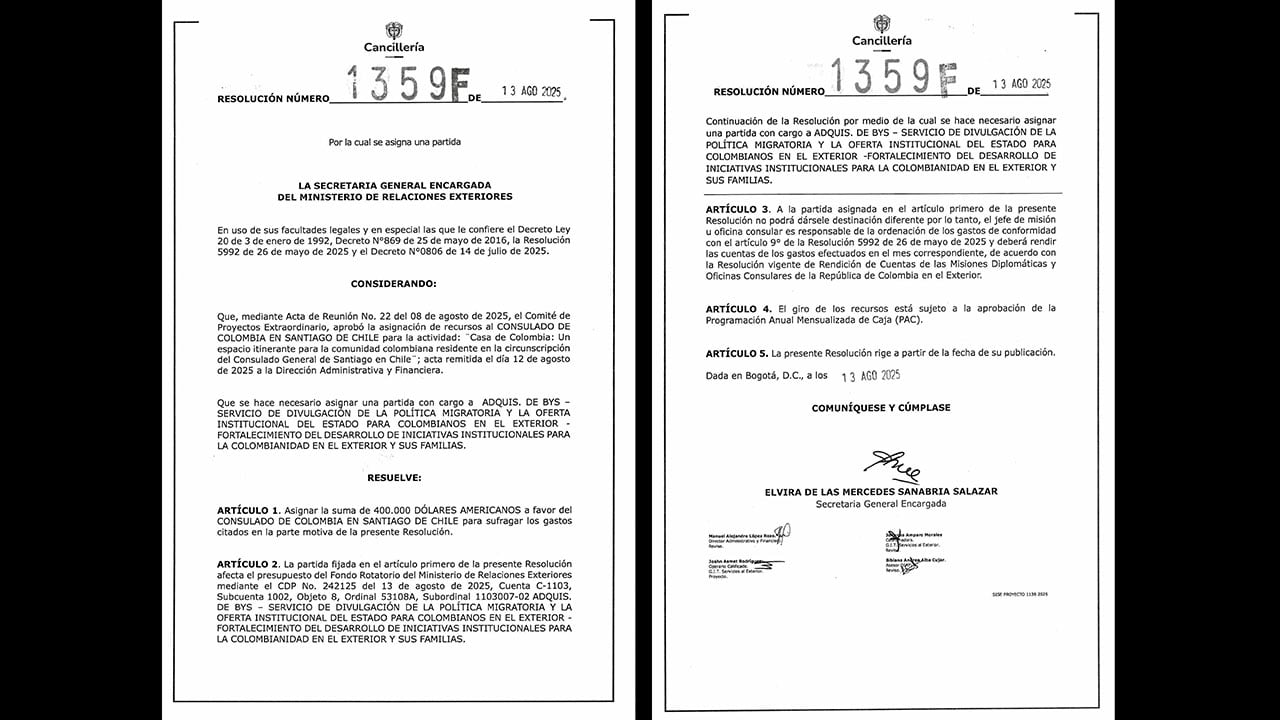 SEMANA conoció la resolución aprobada por la Secretaría General de la Cancillería y por María Carolina Mesa, cónsul de primera de Colombia en Santiago de Chile, para asignar estos recursos y que queden a disposición de la cónsul general en la capital de ese país, María Antonia Pardo. Ella es la responsable de la ejecución del proyecto, que tiene como fecha límite el 20 de diciembre de 2025, es decir, una duración de cuatro meses.
