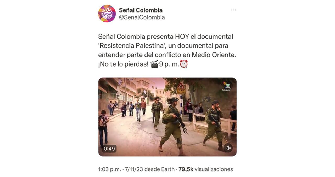 En los canales públicos de Colombia se han visto documentales hechos por Telesur sobre Palestina en los que se presenta al grupo terrorista Hamás como una organización política que lucha por los intereses de los palestinos. Además de dichos reportajes, las franjas informativas de RTVC Noticias son usadas para presentar información del conflicto en Oriente Medio bajo el sesgo del régimen venezolano y contando que Israel ataca inocentes en la Franja de Gaza.