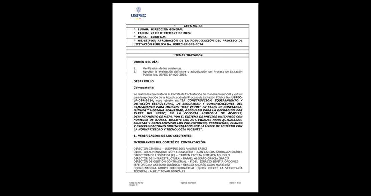 En esa reunión del 2 de diciembre pusieron a consideración un contrato a fin de obtener permisos de vertimientos, ocupación de cauce o concesión de aguas ante las autoridades ambientales para las cárceles a nivel nacional. El contrato quedó en manos del consorcio Aquaintegral 2024, por la suma de 2.825.468.412 pesos.