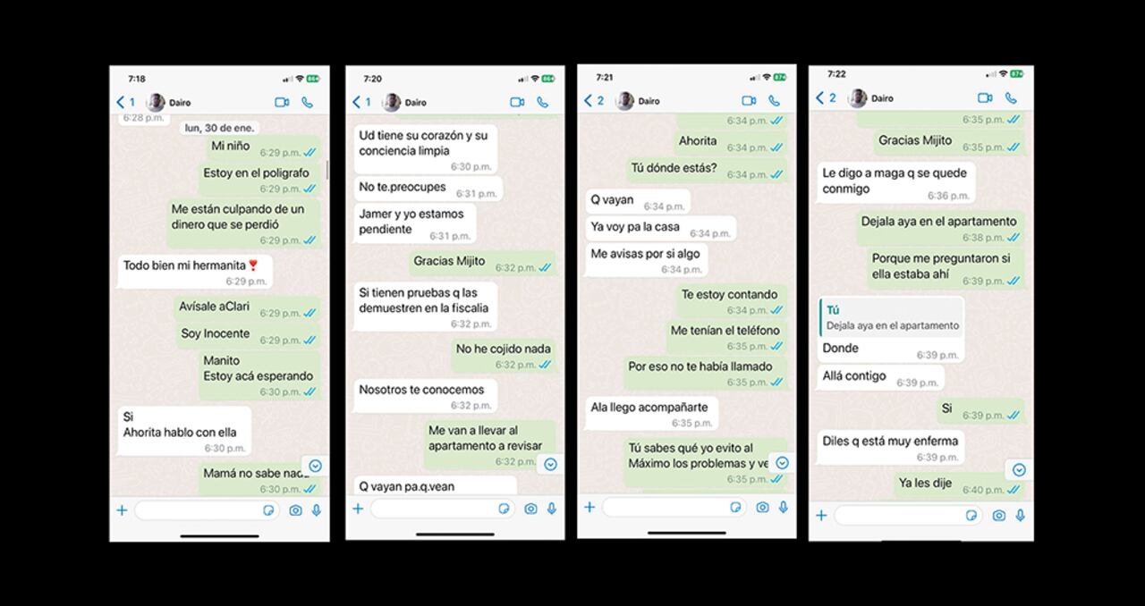 Cuando salió, habría esperado a las afueras de Palacio a que la recogiera otro conductor del Gobierno. Desde allí, a las 6:29 p. m., le escribió a su hermano Dayro: “Mi niño, estoy en el polígrafo, me están culpando de un dinero que se perdió”. Él le respondió: “Todo bien, mi hermanita”. Ella continuó: “Soy inocente, manito, estoy acá esperando”. Él trató de calmarla: “Usted tiene su corazón y su conciencia limpia, no te preocupes, Jamer (su otro hermano) y yo estamos pendientes, si tienen pruebas que las demuestren en la Fiscalía”.