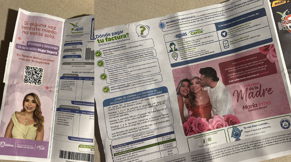 Su salida se gestó después de que su fotografía apareciera en las facturas de los servicios públicos que llegaron a 120.000 hogares, cuando ya se comentaba su aspiración. “María Irma Noreña se apropió de la política pública de ‘Pereira es Mujer’ con fines electorales”, advierte Alejandro García, representante a la Cámara, quien radicó una queja ante la Procuraduría con estas denuncias.