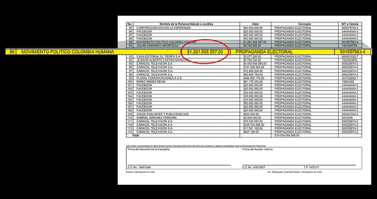 Lo particular es que, cuando se revisan los reportes de propaganda electoral de la campaña de Gustavo Petro a la primera vuelta, aparece el registro de que el Movimiento Político Colombia Humana pagó exactamente ese mismo monto (1.281.565.557 pesos) por concepto de propaganda, una coincidencia particular si se tiene en cuenta que ese es el mismo rubro que aparece girado a nombre de Roa.