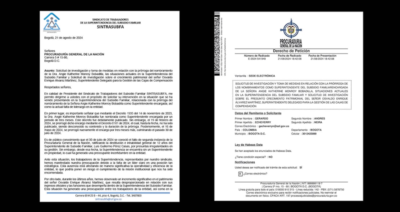 Además, denuncian un “incremento significativo en el patrimonio” de Osvaldo Enrique Álvarez Martínez, superintendente delegado para la Gestión.“Esta situación ha generado una preocupación entre los trabajadores de la entidad, así como en la sociedad en general, debido a las implicaciones éticas y legales que podrían derivarse de un incremento patrimonial no justificado”, explica el documento.