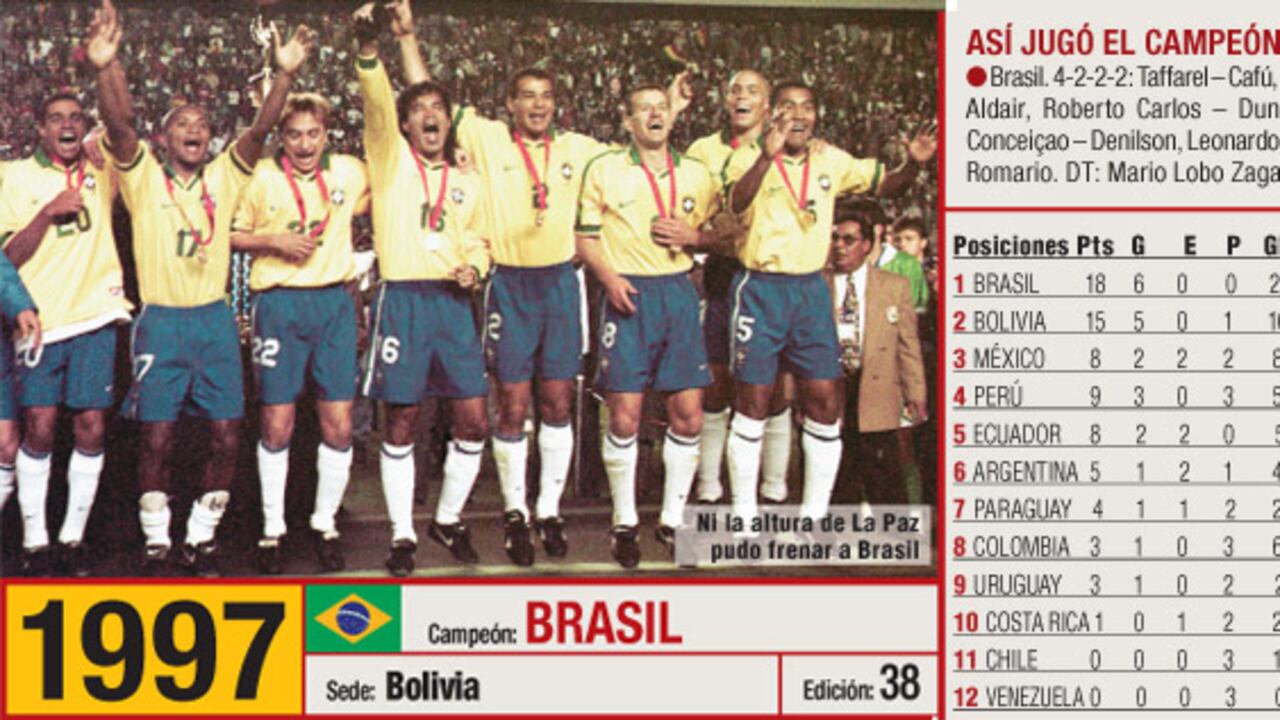 Brasil, con miras al Mundial Francia 98, frustró la aspiración de Bolivia de volver a ganar la copa en casa, obtenida por primera y única vez cuando fueron los anfitriones, en 1963. Con justicia jugaron la final, pues jugaron en serio: los entonces dirigidos por Mario Lobo Zagallo ganaron todos los partidos, y en seis encuentros marcaron 22 goles, a diferencia de algunos equipos que atendieron el evento sin el compromiso requerido, entre ellos Colombia, distraídos por los partidos de las eliminatorias.