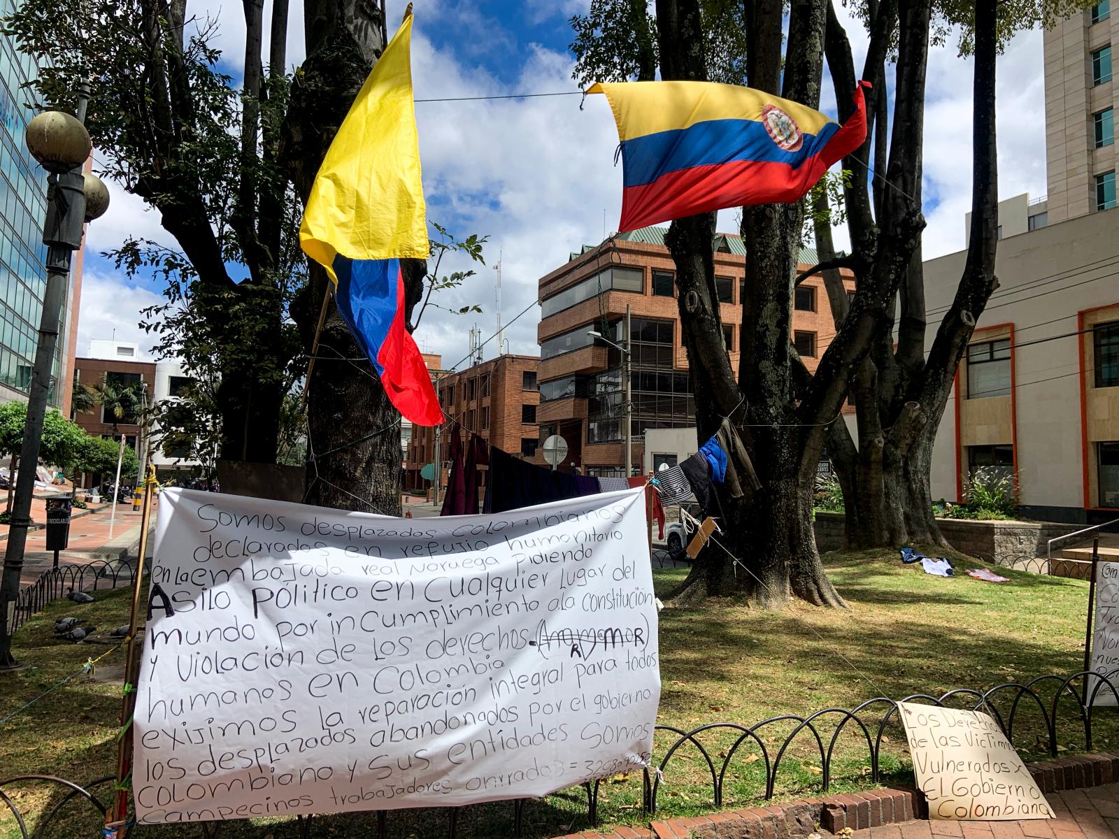 Desde hace dos meses, frente a la embajada de Noruega, cerca de 80 personas víctimas del conflicto armado han pasado los días bajo la lluvia y el sol intenso de Bogotá. Allí, rodeados por cambuches que han improvisado con madera, bolsas plásticas que utilizan para cubrirse del frío en las noches y, algunas de sus pertenencias, esperan a que alguna institución les responda a su llamado de reparación integral que merecen como víctimas.