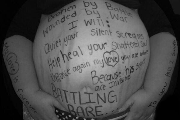 "Herido por la guerra: He jurado luchar por la libertad de mi país. Por favor ayudenme a silenciar mis gritos ahogados, battlando por mí. Algún día estaré completo."