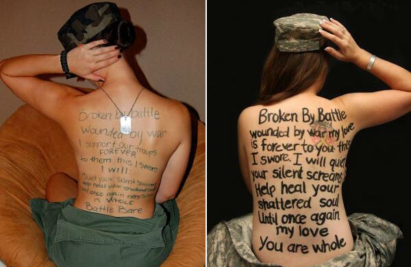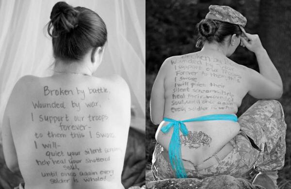 "Herido por la guerra: He jurado luchar por la libertad de mi país. Por favor ayudenme a silenciar mis gritos ahogados, battlando por mí. Algún día estaré completo."