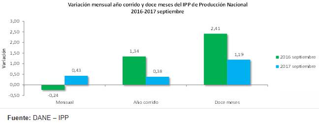 El Departamento Administrativo Nacional de Estadística (Dane) informó este miércoles que el Índice de Precios del productor (IPP) de Producción Nacional en septiembre de 2017 presentó una variación mensual de 0,43%, mientras que en el mismo mes de 2016 esa variación fue de -0,24%.