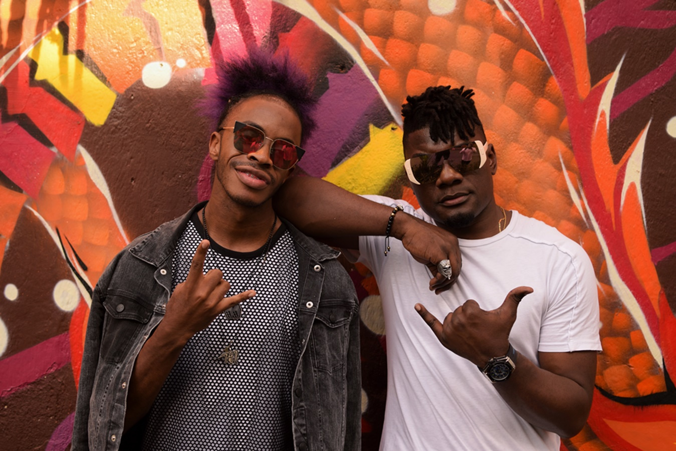 Bomby (izquierda) junto a Donki, que tiene 30 años y es de Bagadó, Chocó. Canta desde hace 10 años y apenas llegó a Medellín en 2017, buscando nuevas oportunidades para su carrera musical y con este éxito siente que se le han dado. /